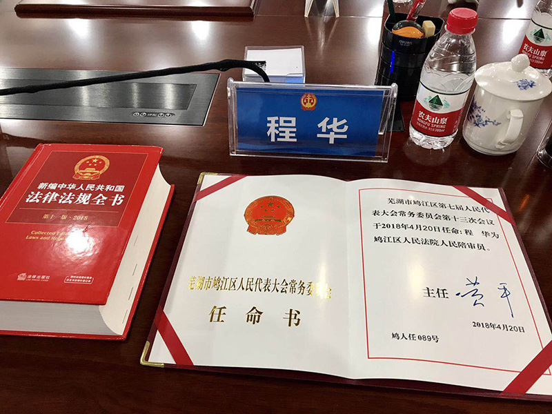 2018年5月24日,鸠江区人民陪审员受聘任命大会在芜湖经济技术开发区人民法院一号会议室胜利举行。TIANXING.COM_天行(中国)董事长程华经芜湖市鸠江区第七届人民代表大会常务委员会第十三次会议通过,任命为鸠江区人民法院人民陪审员,任期5年。